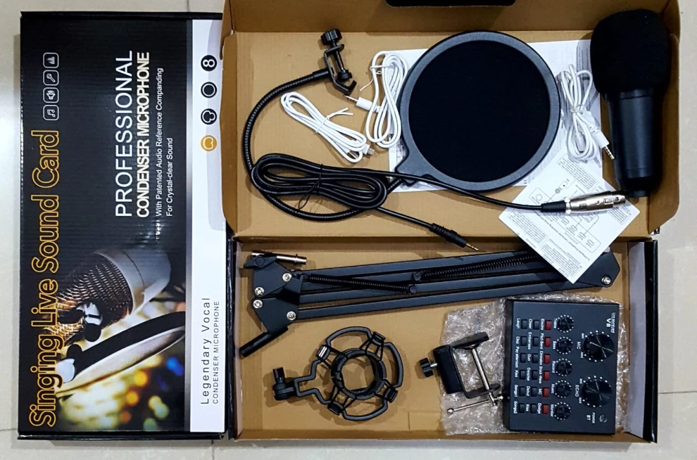 مجموعة شاملة متكاملة – تشمل ميكروفون استوديو مكثف، ذراع قابل للتعديل، فلتر هواء، غطاء ميكروفون، ولوحة تحكم صوتية احترافية