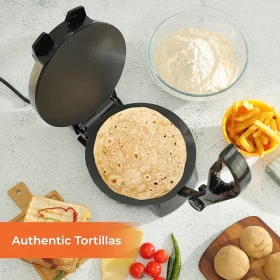 حضّر خبز الشباتي الطازج بسهولة وسرعة مع آلة صنع الشباتي والروتي الكهربائية المصممة لتسهيل تحضير الخبز المسطح مثل الشباتي والروتي والتورتيلا في دقائق.