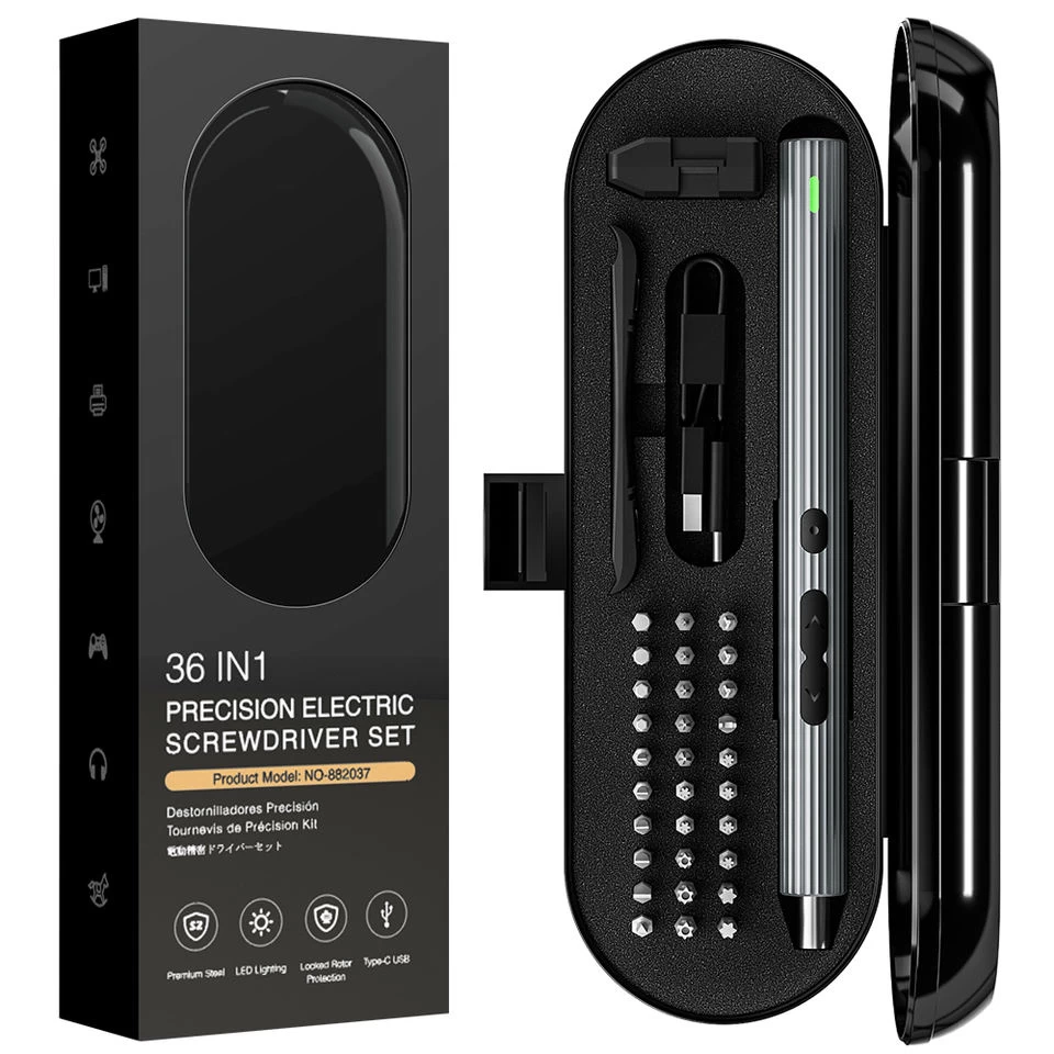 عدة مفكات كهربائية متعددة الاستخدامات مع 36 رأس مختلفة لتلبية جميع احتياجات البراغي. قابلة لإعادة الشحن ومحمولة، مثالية للاستخدام المنزلي، المكتبي، والأعمال اليدوية.