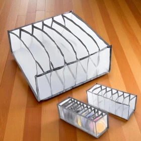 يتكون هذا الطقم من 3 صناديق شبكية متينة بأحجام مختلفة (6 شبكات، 7 شبكات، 11 شبكة)، مصممة لحفظ الملابس الداخلية والجوارب والملابس الخفيفة بشكل مرتب وسهل الوصول. قابل للغسل والطي، مثالي للاستخدام في الأدراج، الخزائن أو غرف الملابس.