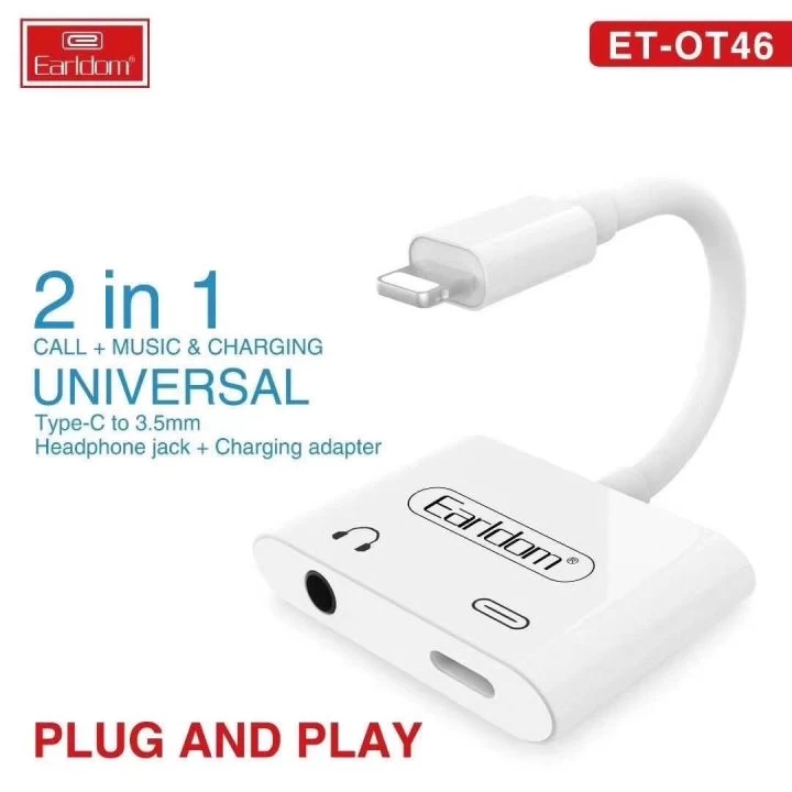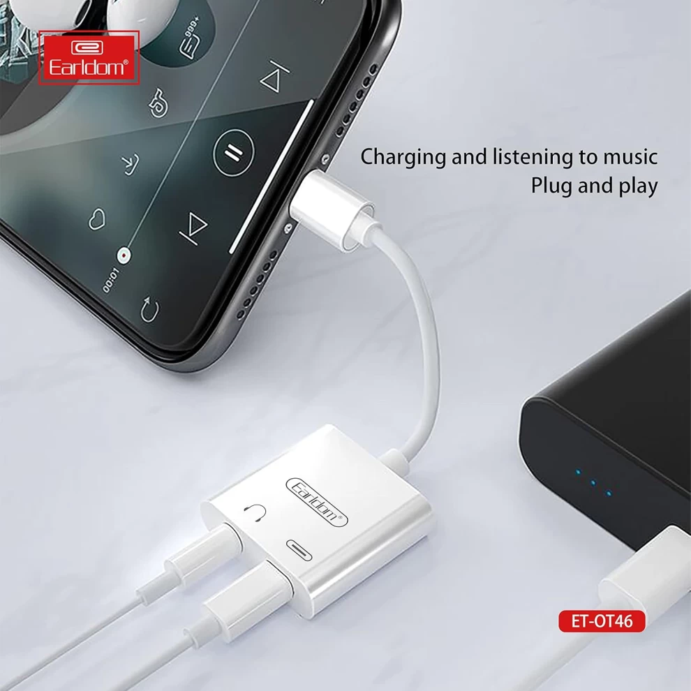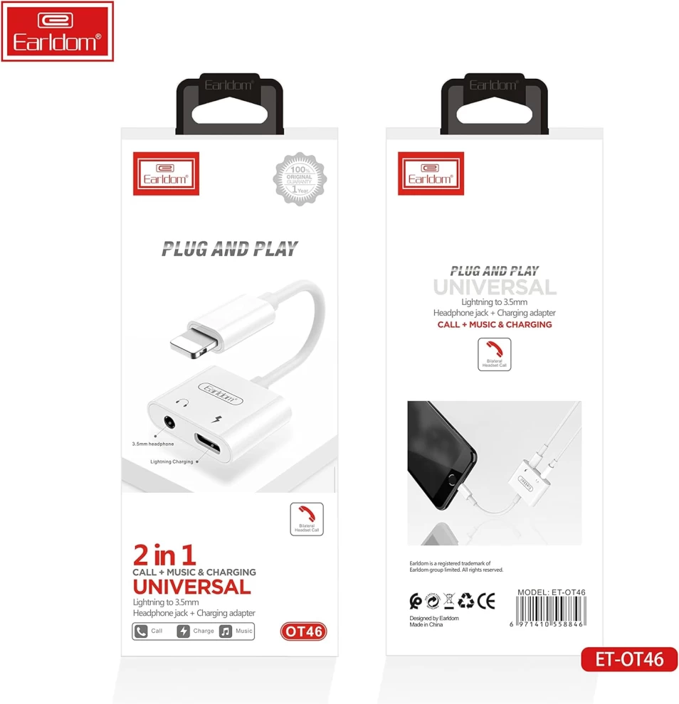 • محول Lightning 2 في 1 من Earldom OT-46 (منفذ Lightning واحد ومنفذ 3.5 مم) مع وظيفة التحدث المباشر