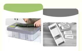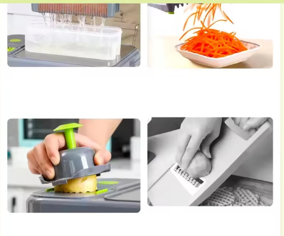 اجعل تحضير الطعام أسرع وأسهل وأكثر متعة مع قطاعة الخضار المتعددة 13 في 1. تحتوي على 8 شفرات من الستانلس ستيل قابلة للتبديل، و 4 حاويات تخزين، مع مقشرة و فرشاة تنظيف. مثالية لتقطيع وتقطيع مكعبات وبشر الخضروات والفواكه بكل سهولة. أداة أساسية للمطابخ العصرية والعائلات المشغولة ومحبي الطبخ الصحي.
