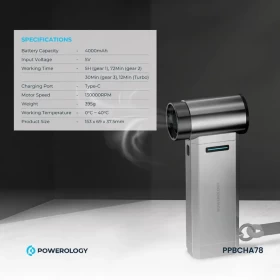 احصل على أداء قوي بوظيفتين في جهاز واحد مع Powerology Turbo Jet Fan & Vacuum، المصمم لتوفير هواء قوي لإزالة الغبار مع خاصية الشفط للتنظيف الفعّال. مثالي لتنظيف الإلكترونيات والسيارات والمكاتب والأماكن الضيقة.