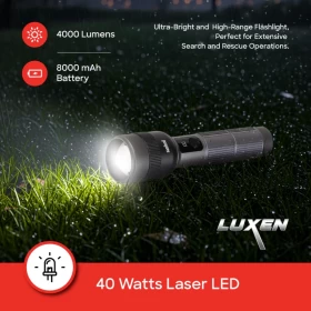 تمتع بإضاءة قوية مع كشاف Sanford SF6198SL القابل للشحن، المزود بتقنية LED ليزري بقوة 40 واط لتوفير سطوع قوي ومدى إضاءة ممتاز. يأتي مع خاصية الزووم، 5 أوضاع إضاءة، وشاشة رقمية لعرض مستوى البطارية، مما يجعله مثاليًا للرحلات، الطوارئ، والعمل اليومي.