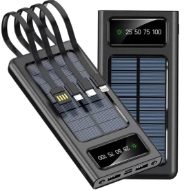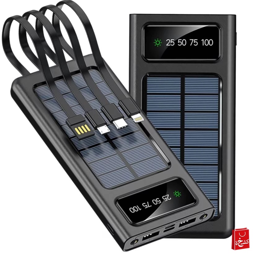 باور بانك شمسي 20000mAh – شاحن محمول مقاوم للماء USB مع كابل مدمج