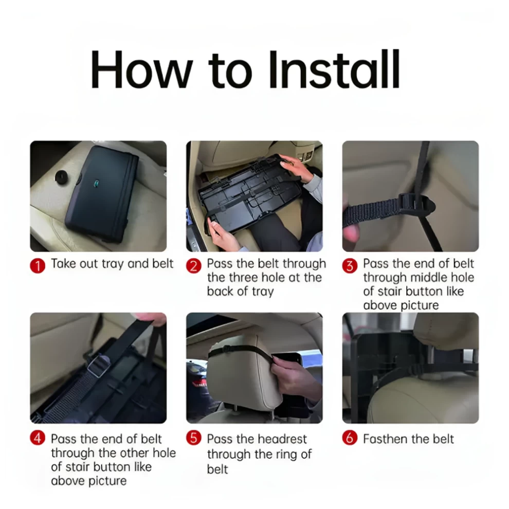 2. Hang the tray on the back of the front seat using the built-in hooks or straps