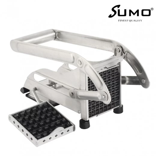 Make restaurant-quality fries quickly and easily at home with this durable stainless steel slicer. Equipped with two interchangeable blades (1/2-inch and 3/8-inch), it's ideal for slicing potatoes, carrots, onions, and other vegetables. Its sturdy design and non-slip base ensure a consistent and safe slice every time.