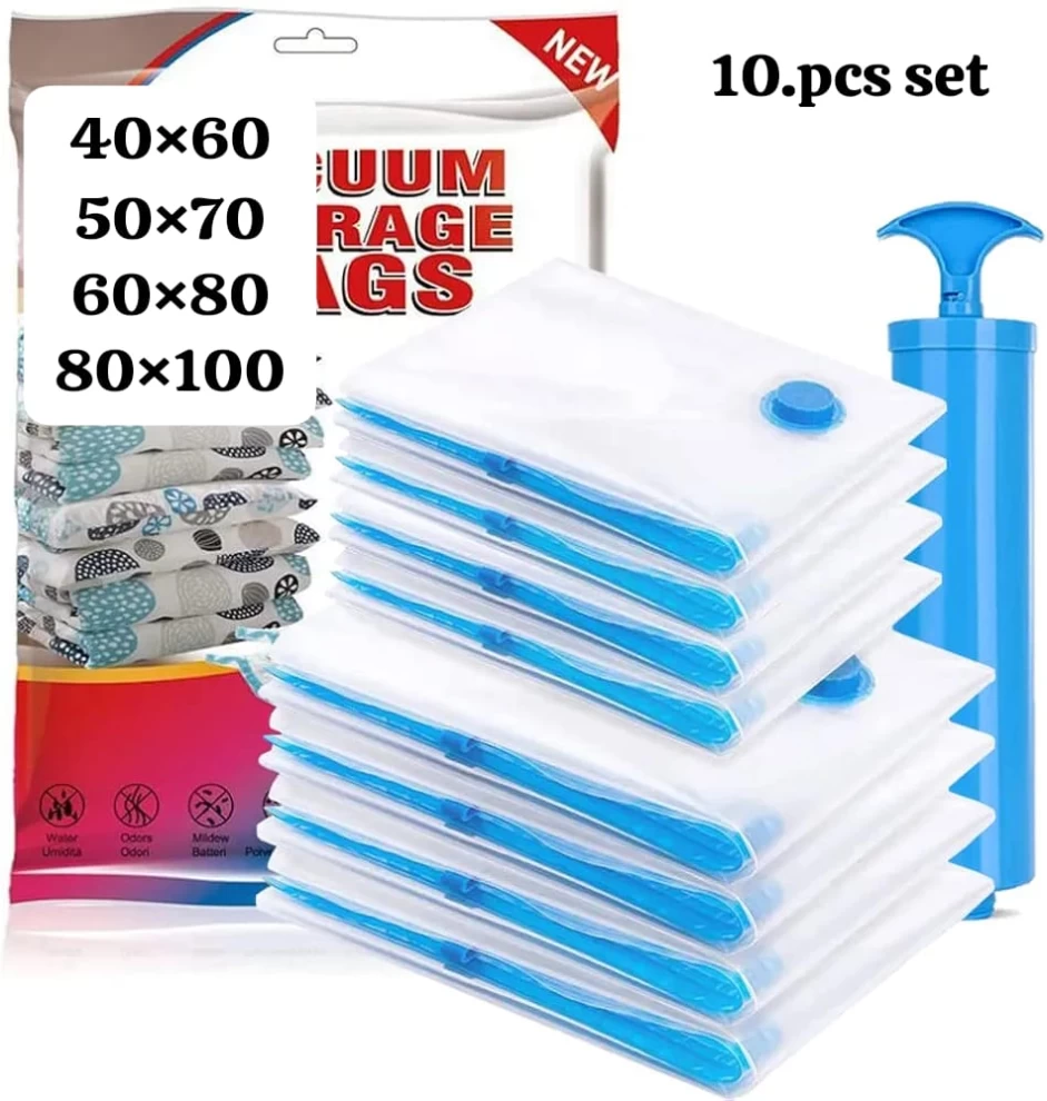 Maximize your storage space with the Vacuum Storage Bags Set (10 PCS). Designed to compress clothes, blankets, bedding, and seasonal items, these durable space-saving bags help keep your home organized while protecting items from dust, moisture, and insects. Perfect for home storage, travel, and wardrobe organization.