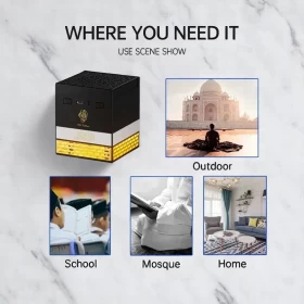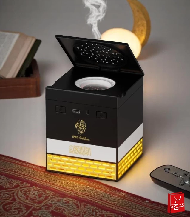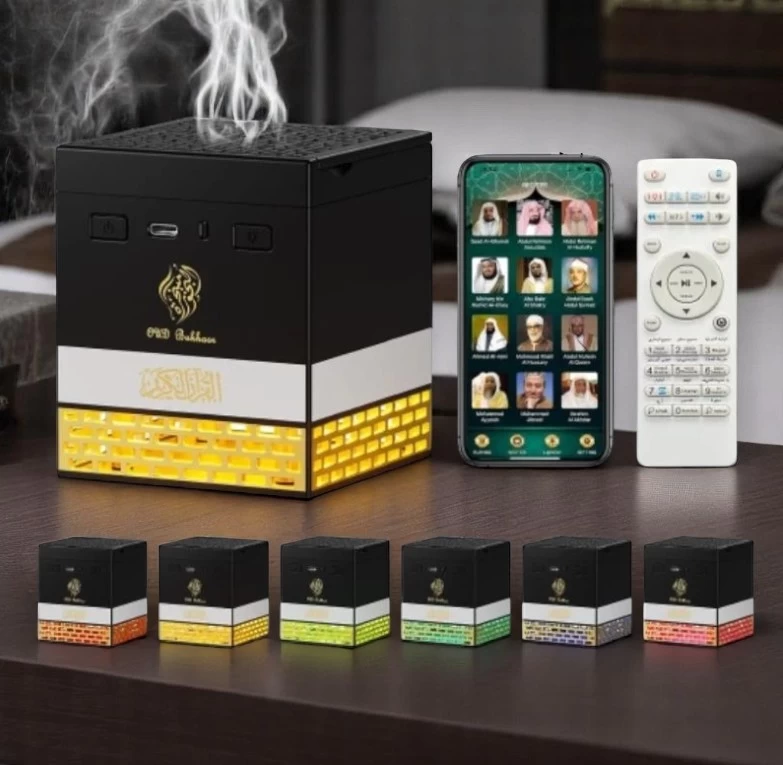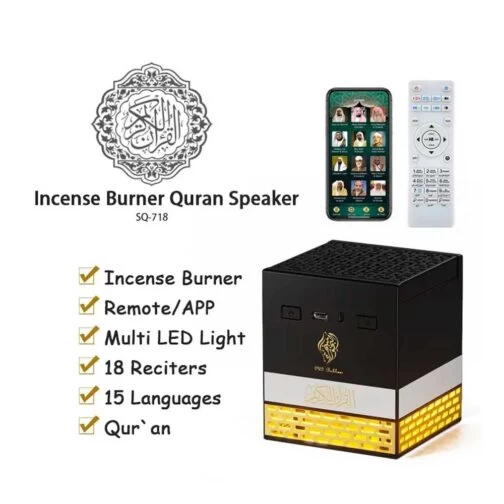 Enjoy the essence of spirituality with the SQ-718 Multi-functional Oud Burner! A smart incense burner combined with a Full Quran speaker, LED mood lighting, remote and app control – perfect for home, office, or prayer space.
