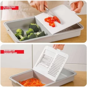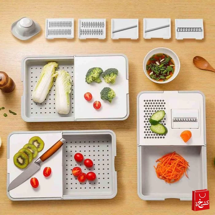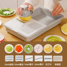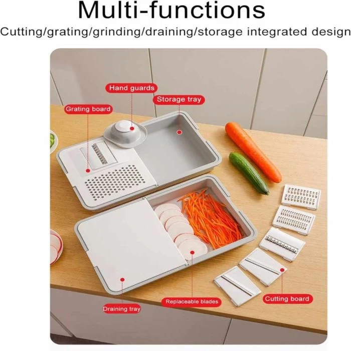 Make food preparation faster and easier with the Multifunctional Vegetable Cutter and Peeler, designed to slice, shred, grate, and peel with precision. Featuring 5 interchangeable stainless steel blades and a built-in storage tray, it keeps your kitchen clean while delivering professional cutting results.