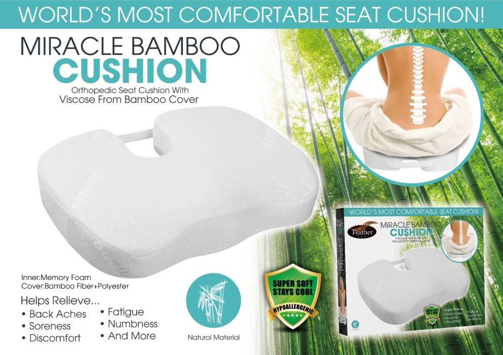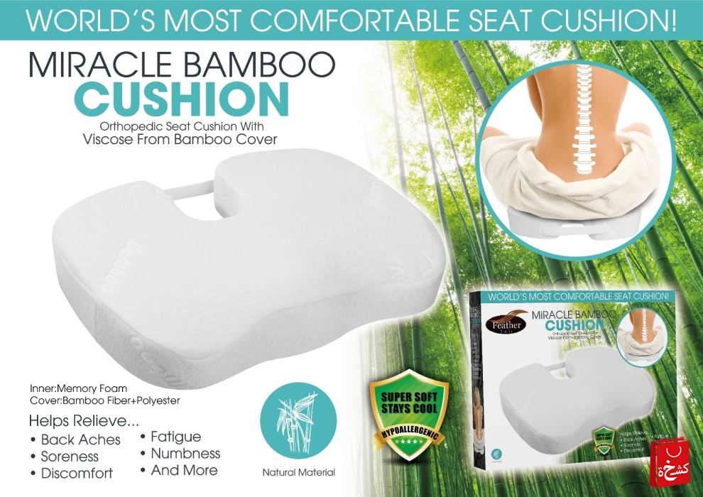The Miracle Bamboo Seat Cushion is designed to deliver ultimate comfort and orthopedic support while sitting. Made with premium memory foam and a breathable bamboo fiber cover, this cushion helps relieve back aches, soreness, fatigue, and numbness caused by long hours of sitting. Its super-soft, cooling, and hypoallergenic design ensures comfort whether you're at work, driving, or relaxing at home.