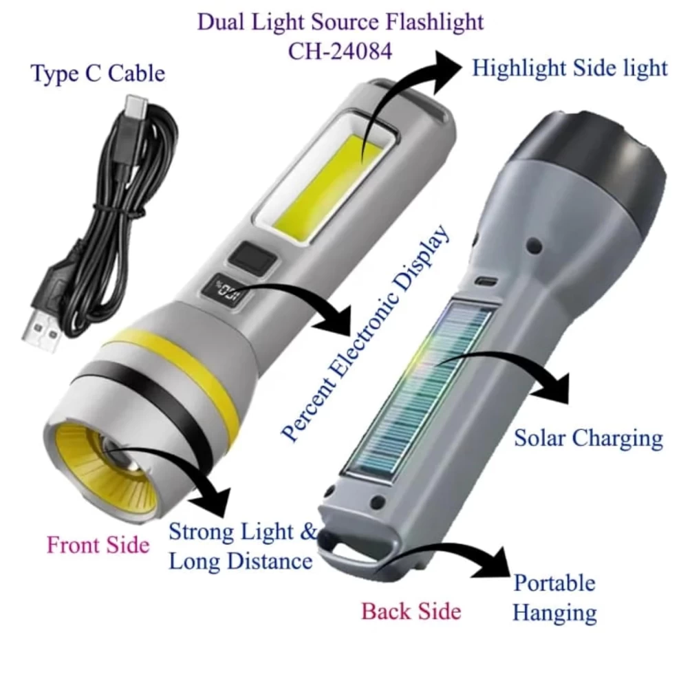 • 🔋 Dual Charging – Solar + USB Type-C: Charge the torch conveniently using a USB Type-C cable or the built-in 2V 1W solar panel—ideal for both indoor use and off-grid outdoor adventures.